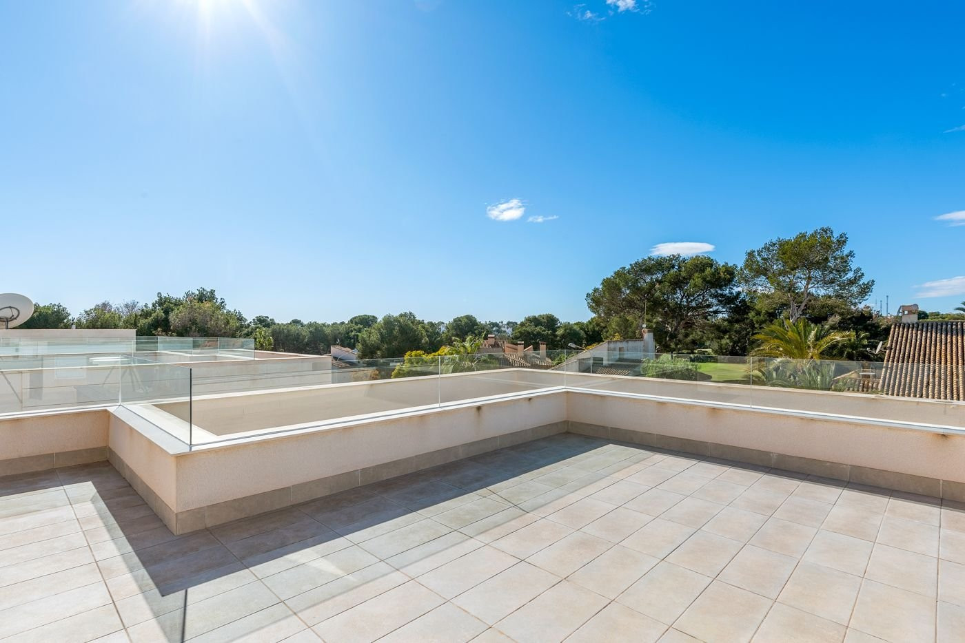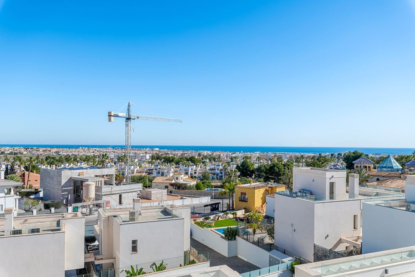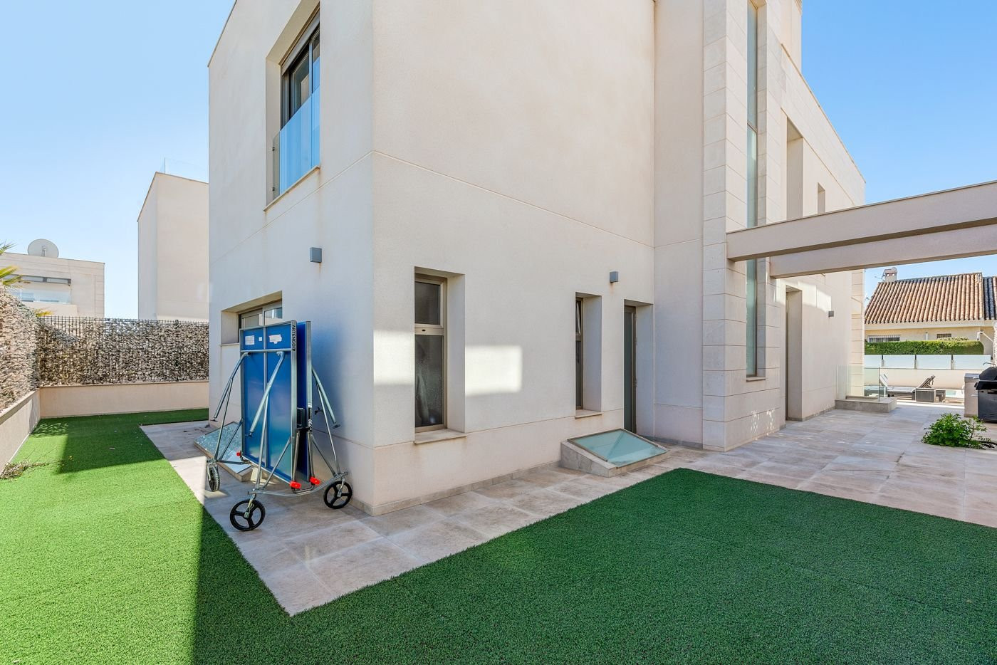This impressive villa from 2018 is created in an elegant and modern style with plenty of space and functional solutions.With a total of 197 m² spread over three - actually 4 floors, you get a home that combines style, comfort and flexibility - perfect both as a year-round home and as a luxurious holiday home.Interior and floor planThe villa offers 6 bedrooms (one is used as an office today) and 3 bathrooms, distributed over the different levels, which provides optimal settings for both family life and guests.On the ground floor you will find a large, open kitchen with a kitchen island and a good dining area, and the large windows ensure a beautiful influx of light.In addition, there is a separate TV room that creates a cozy atmosphere. A guest toilet completes the floor.On the first floor is the master bedroom with its own access to a nice balcony and also with its own bathroom (ensuite), as well as two more spacious bedrooms and an additional bathroom.From this floor there is access to a large roof terrace with a summer kitchen and a large spa bath, where you can enjoy the warm evenings and the fantastic view.The villa also has a full basement, which provides plenty of extra space. Here you will find:- A large garage with space for several cars and storage- 2 additional bedrooms- 1 office/bedroom- 1 bathroom- Extra storage room- The driveway to the garage/basement is made with a cover like a carportFantastic outdoor areas and luxury facilitiesThe outdoor areas of the home are designed to enjoy the Spanish climate.Here you will have your own private swimming pool, where you can cool off on hot summer days. The swimming pool also has heating, so you can also enjoy a good temperature in the pool in winter. In the garden area you also find a summer kitchen with a barbecue.On the roof terrace you will also find a spa, perfect for relaxation with views of the golf course, the city lights and all the way to the sea.There is also an outdoor shower to cool off when sunbathing.The home is equipped with air conditioning that can both heat and cool, so you are guaranteed a comfortable temperature all year round, as well as underfloor heating in the bathrooms for extra comfort. In addition, there is an alarm system and fiber internet, so both security and modern technology are in place.Perfect location - close to everythingThe villa has an attractive location in Villamartin, an area known for its beautiful golf courses and proximity to the coast. Here you live close to everything you need:Villamartin Golf Course - one of the area&039;s most popular golf coursesVillamartin Plaza - with restaurants, bars and a supermarket within walking distanceZenia Boulevard - one of Spain&039;s largest shopping centers (2.8 km, approximately 10 minutes by bike)Playa de la Zenia - one of the best beaches in the area (8 minutes by car)Alicante Airport - 40-50 minutes drive depending on route choiceA unique opportunity to own a spacious and modern villa in an attractive area.Contact us today to book a viewing.