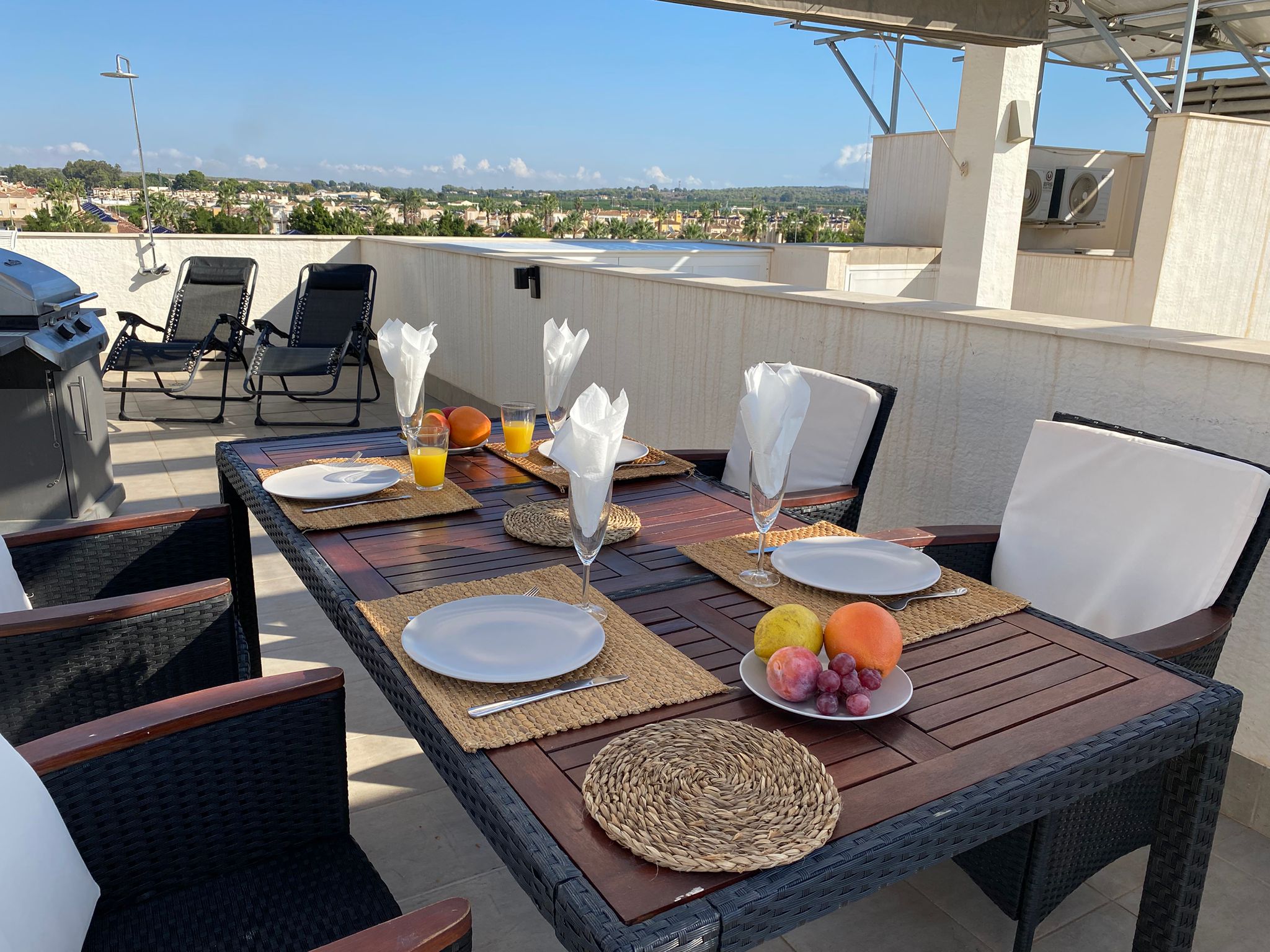 Exclusive Penthouse with Private Rooftop Terrace – Built in 2019Are you dreaming of a modern holiday home in Spain where luxury, comfort, and tranquility meet? This elegant penthouse apartment has it all – a spacious private rooftop terrace, stylish interiors, fantastic communal facilities, and a unique location close to the famous La Mata salt lake.Property HighlightsPrivate 67 m2 rooftop terrace with open views towards El Raso and the mountains2 bright bedrooms with built-in wardrobes – master with en-suite bathroom2 modern bathrooms with sleek finishesSpacious open-plan kitchen and living area with high ceilings and natural lightSouth-facing terrace overlooking the palm garden, pool, and Torrevieja’s evening skylineAir conditioning in both the living room and bedroomsPrivate underground parking with space for a car and bicyclesPremium Community FacilitiesThe gated complex offers everything you need to enjoy life under the Spanish sun:Two large pool areas surrounded by lush gardens and palm treesFitness area, mini golf, pétanque court, and children’s playgroundExclusive spa with jacuzzi and sauna (including infrared option)Perfect LocationThe apartment is set in a peaceful area with restaurants, bars, and a minimarket within walking distance. Every Sunday you can also explore a large local “lemon market” nearby.Only 4.5 km from some of the best beaches on the coastClose to the La Mata salt lake, renowned by WHO for its healthy microclimate – great for asthma, allergies, and joint issuesScenic surroundings with palm trees, mountain views, and sunshine year-roundAn Ideal Investment – and a Retreat in the SunWhether you’re looking for your private holiday getaway or a lucrative rental opportunity, this penthouse is a rare combination of modern comfort, stunning surroundings, and a prime location.Contact us today for more information or to arrange a viewing – this property is a must-see!