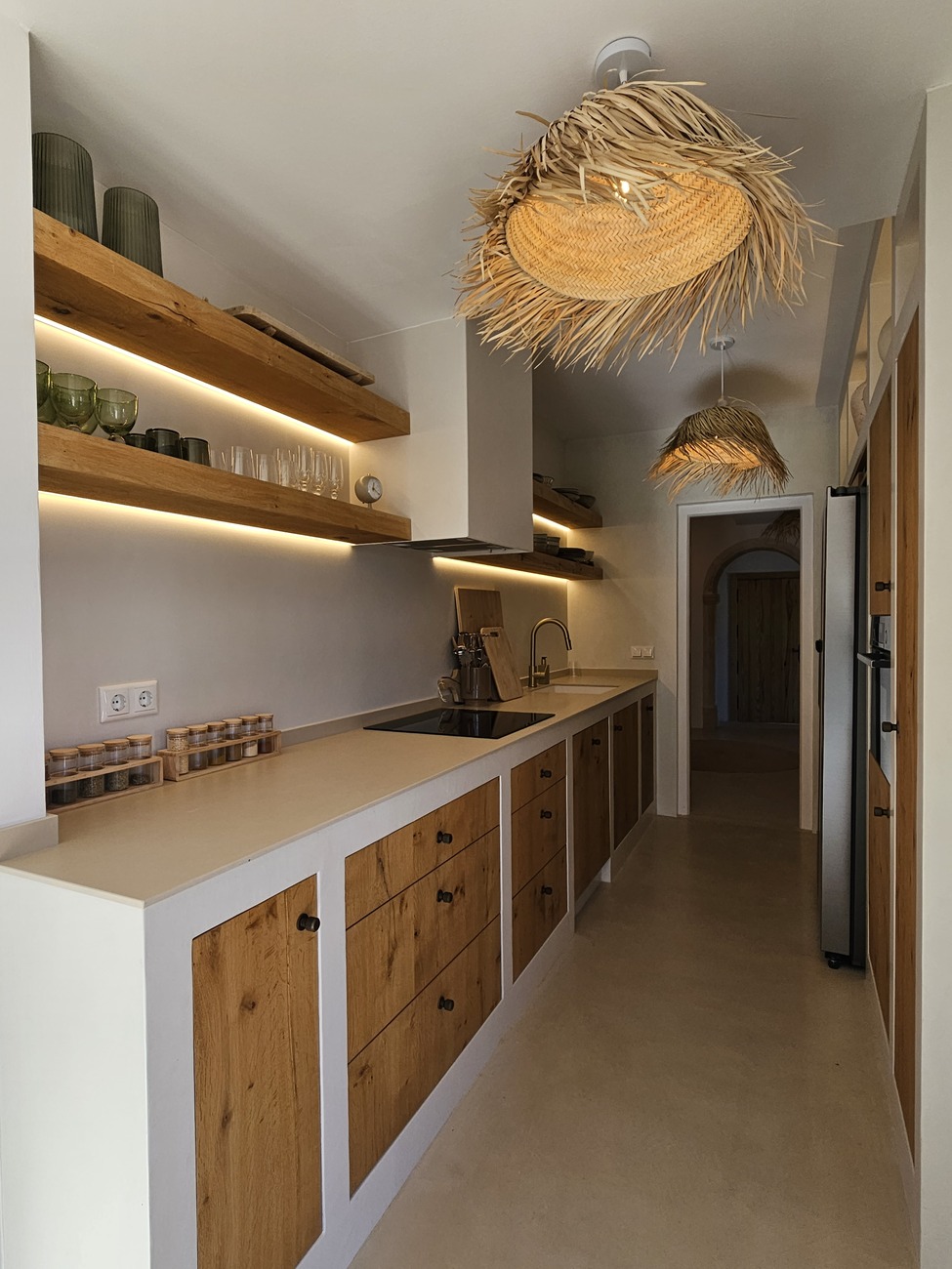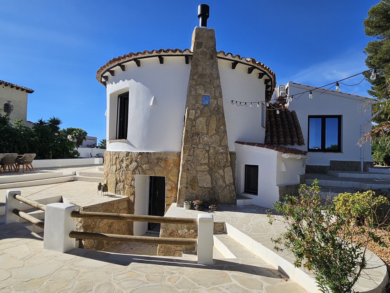 Situated in Balcón al Mar area, this exceptional villa occupies an elevated plot that provides sea views from nearly every corner of the property.Recently refurbished from top to bottom, the home effortlessly blends classic Mediterranean character with contemporary luxury. The renovation includes new double-glazed windows and doors, sleek microcement flooring, and beautifully restored original Castellano wooden doors, maintaining charm while ensuring comfort. The Ibiza-inspired kitchen stands out with its premium appliances, minimalist finishes, and laid-back yet sophisticated atmosphere.The property can be accessed either through a pedestrian entrance or via the private garage, which offers space for a large car. From here, an internal staircase connects directly to the lower level, while another leads up to the main hallway.A charming wooden front door opens into an elegant entrance area featuring a guest toilet and built-in wardrobes. From the central hallway, you reach two bedrooms, each with its own en-suite bathroom, as well as the spacious living area and fully equipped kitchen. The bright dining space, connected to the kitchen, opens through large glass doors onto the terrace, offering lovely views of the pool, garden, and the sea beyond. The living room also enjoys expansive sea views and includes a cozy wood-burning fireplace, perfect for cooler evenings.Abundant natural light fills the home through its numerous windows, and hot-and-cold air conditioning ensures comfort all year round.On the lower level, there is a laundry and utility room housing the technical installations, along with a versatile room featuring an en-suite bathroom and direct terrace access — ideal as a gym, spa, or guest suite.From the main terrace, a spiral staircase leads up to the rooftop solarium — a peaceful hideaway with magnificent sea views and ample space for relaxation.One of the highlights of this property is the stunning pool area. The entire exterior has been newly finished with elegant German stone tiles, giving it a fresh and modern look. The 10x5 metre pool is lined with luxurious Bali-green tiles, surrounded by spacious sunbathing areas and an outdoor shower.The low-maintenance Mediterranean garden is thoughtfully designed with gravel, mature hedges for privacy, and a selection of plants and fruit trees that thrive in the local climate.A separate guesthouse completes the property. It features its own entrance, a fully equipped kitchen, a covered naya/living area, and a large double bedroom with an en-suite bathroom — perfect for visitors or family members seeking independence. Next to the guesthouse, there are two additional storage rooms, and at the rear of the property, a private office with its own terrace and sea views — an ideal workspace in a serene setting.This beautifully renovated villa, complete with guesthouse, multiple versatile spaces, and breathtaking sea views, is an exceptional choice for a family home or a luxurious Mediterranean getaway.
