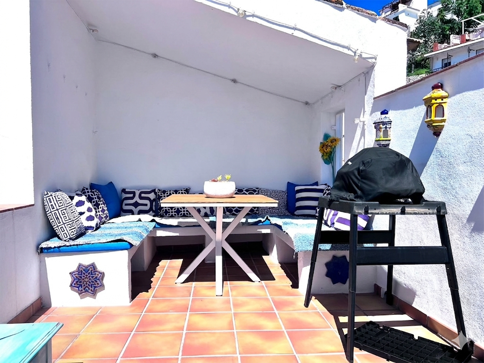 Letar du efter ett charmigt hus i en av Andalusiens autentiska vita byar? Denna underbara fastighet kan vara precis det du har letat efter. Den ligger i det mycket eftertraktade Canillas de Aceituno, i den vackra regionen Axarquía i Málaga, och erbjuder både karaktär och bekvämlighet. Detta hus med 3 sovrum har ett idealiskt läge i hjärtat av byn och ligger i en lugn miljö utan störningar. Du befinner dig bara 30 minuter från kusten och 50 minuter från Málagas flygplats – perfekt för att kombinera lugn med enkel tillgänglighet. Canillas de Aceituno är en livlig och pittoresk by känd för sin charm och utmärkta vandringsleder. Detta unika radhus sträcker sig över två våningar och erbjuder generöst med boyta. Det är fullt möblerat och inflyttningsklart och kombinerar traditionell karaktär med modern komfort, inklusive dubbelglasfönster, luftkonditionering, golvvärme, ett genialt solvärmesystem för de kallare vintrarna och fiberinternet. När du kommer in möts du av en hall. Till vänster finns en gästtoalett, medan du till höger hittar ett sovrum som för närvarande används som kontor, tillsammans med ett andra sovrum. En trappa leder till ett charmigt kök som gränsar till ett rymligt vardagsrum och matplats. Härifrån når du ett mysigt TV-rum och det stora sovrummet. En annan kort trappa tar dig till ett badrum med dusch, toalett och tvättmaskin. Om du fortsätter uppåt hittar du två härliga takterrasser – perfekta för att koppla av och njuta av den fridfulla omgivningen och den vackra utsikten. Denna exceptionella fastighet är ett sällsynt fynd och kommer inte att finnas kvar på marknaden länge. Kontakta oss idag för mer information eller för att boka en virtuell eller personlig visning.